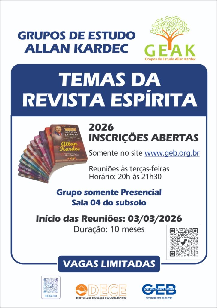 Já estão abertas as inscrições para o estudo de Temas da Revista Espírita. Venha participar desta primeira turma. As reuniões serão presenciais! Participe! Navegação de Post Muito obrigado a todos que tornaram realidade mais uma Distribuição Semestral do GEB!